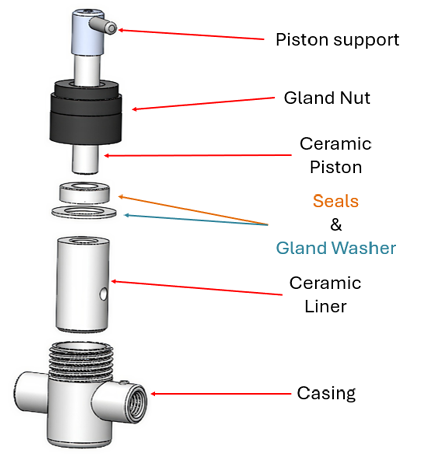 (CeramPump® exploded view showing ceramic wetted path components (piston, seal, ceramic liner, and cylinder case)